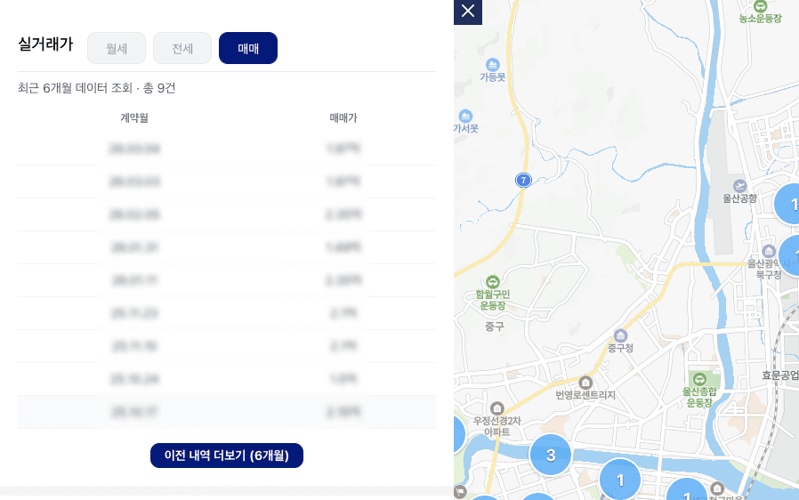 울산 지역 부동산 실거래가 데이터를 서비스 안에서 바로 확인할 수 있습니다. 고객 상담 시 정확한 시세 정보를 근거로 더 신뢰 있는 중개 서비스를 제공하세요.